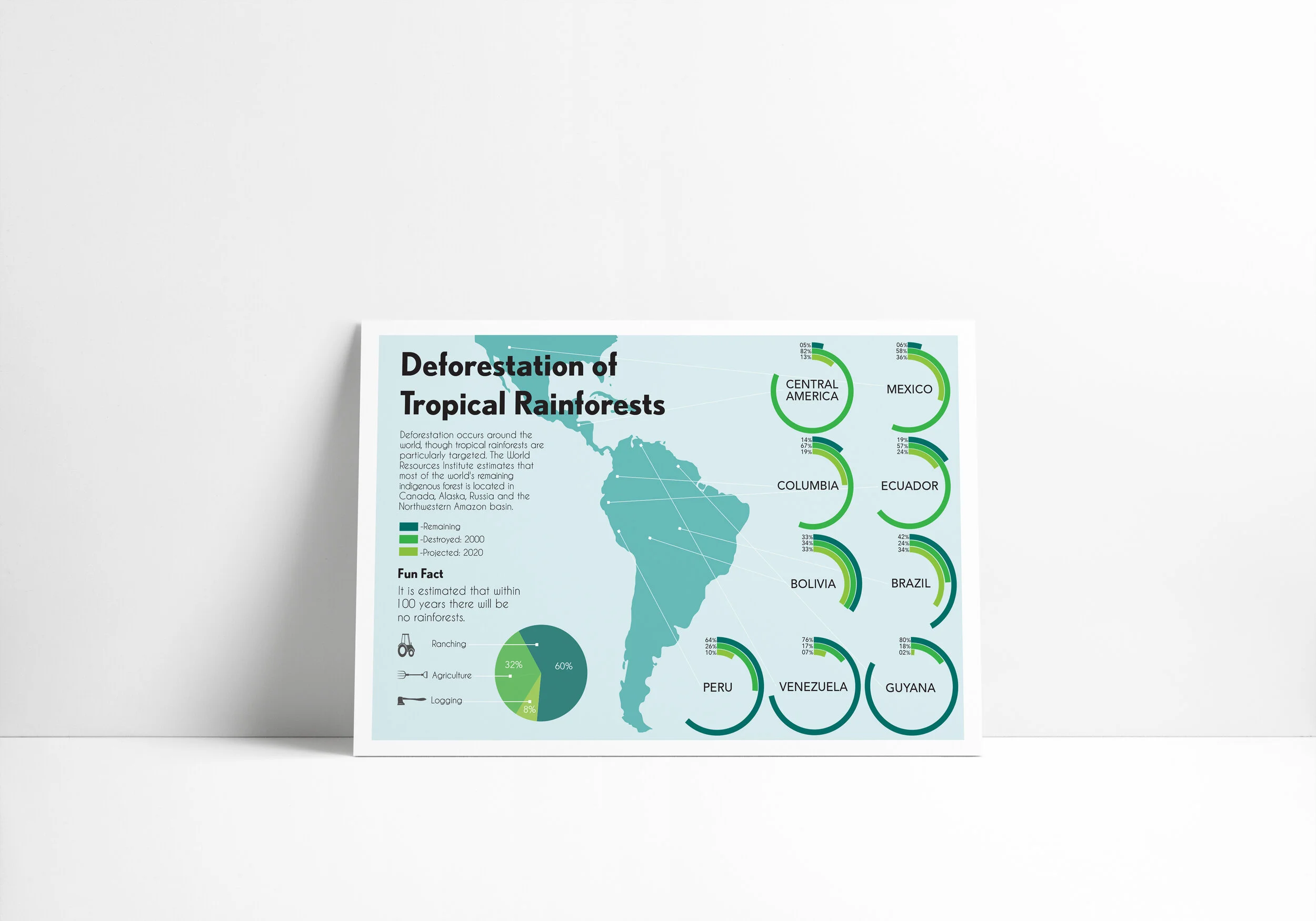 The objective was to design a poster about the deforestation happening in the tropical rainforests. It needed to be simple and easy to navigate while also displaying all of the percentage of each area. The target viewers are North Americans because they are the people that can help make a change. Deforestation Poster I chose to design this with natural colours because the poster is about nature and the environment, and how we can help. I used different shades of green to represents the trees and plants being destroyed.